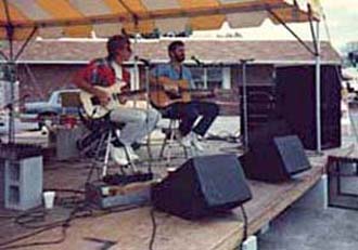 | Unable to find a band when I first got to Florida, I talked my old friend, Donn Huffman into forming "Double Trouble", a 2 man electric-acoustic act that concentrated mainly on Donn's strong vocals, supported by my electric fills and leads. Worked pretty well, too. We worked steady at Blue Water Bay out in Melrose, The Copper Monkey in Gainesville, and a handful of other small venues. Even after convincing Area Code to hire me, we continued to work for a year or so, before Donn and his wife Marie moved to Ohio. Little known fact: Donn was the one who taught me my first chords, out in Hawai. "What a long strange trip!" | ![]() |