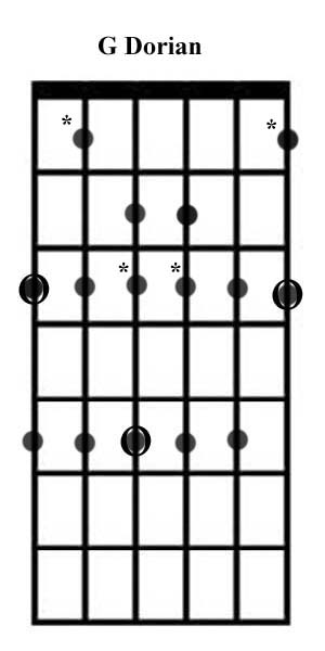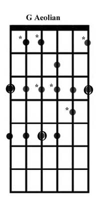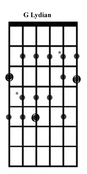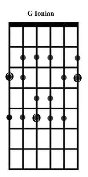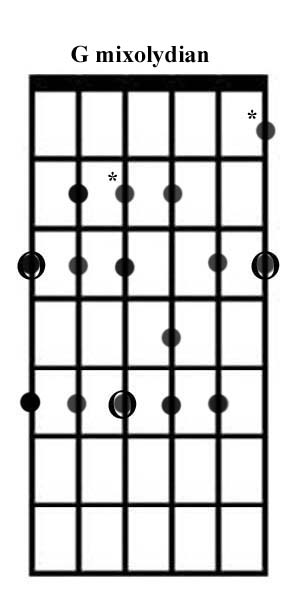 These are modes, in the key of G. There are 2 more, the Phrygian, and Locrian, but they're used a lot less than these 5. Modes are like scales, each having it's own set pattern of whole and half step notes, and each it's own sound.. To fully explain it would take more space tha allowed on this page, so we'll save that for later. But to start with, the ionian mode is a major mode, having the same notes and sound as the diatonic major scale, the dorian is a minor mode, with a jazzy feel, the mixolydian is a major mode, and differs from the ionian by just one note, the b7, and is used in blues and jazz. The aeolian is another minor mode, having the same notes and sound as the natural minor scale, and the lydian is another major mode, differing from the ionian by just one note, the #4.